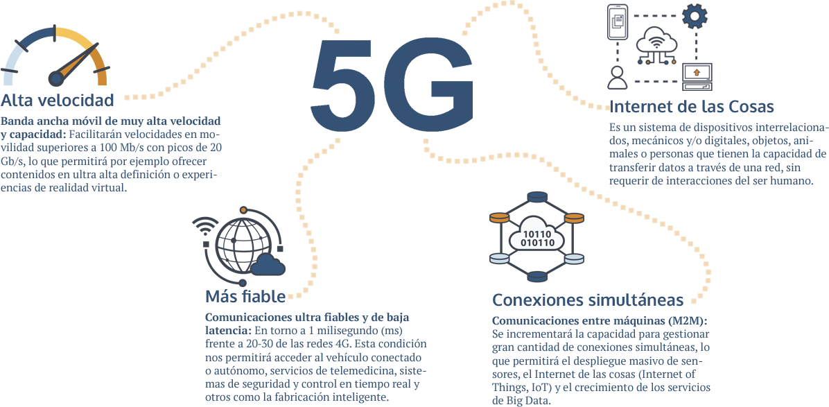La red 5G permitirá que los dispositivos envíen datos a través de internet de una forma mucho más veloz y sin fallos, lo que hará la red más segura y agilizará el intercambio de información tanto en almacenes, como en ciudades inteligentes, cadena de transportes, etcétera.